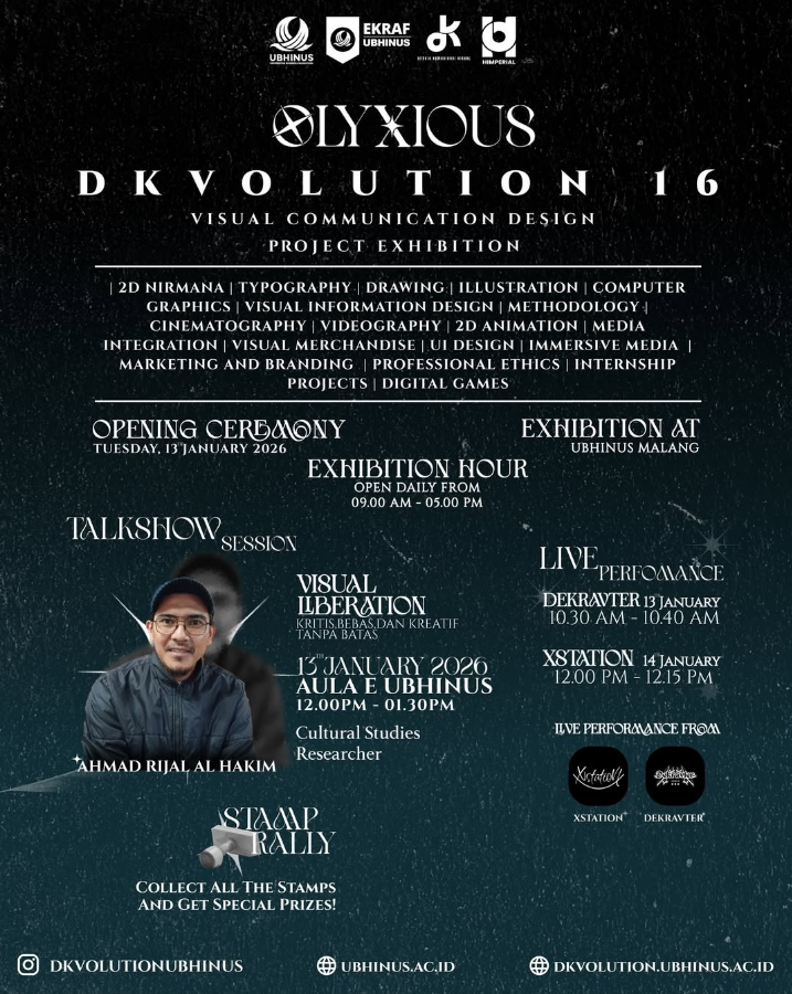 Universitas Bhinus Indonesia (UBHINUS) menyelenggarakan kegiatan DKVOLUTION 16 yang berlangsung selama tiga hari, mulai 13 hingga 15 Januari 2026, bertempat di Kampus UBHINUS. Kegiatan ini menjadi ajang kolaboratif yang mengintegrasikan kreativitas desain, inovasi teknologi, serta pengembangan potensi mahasiswa.